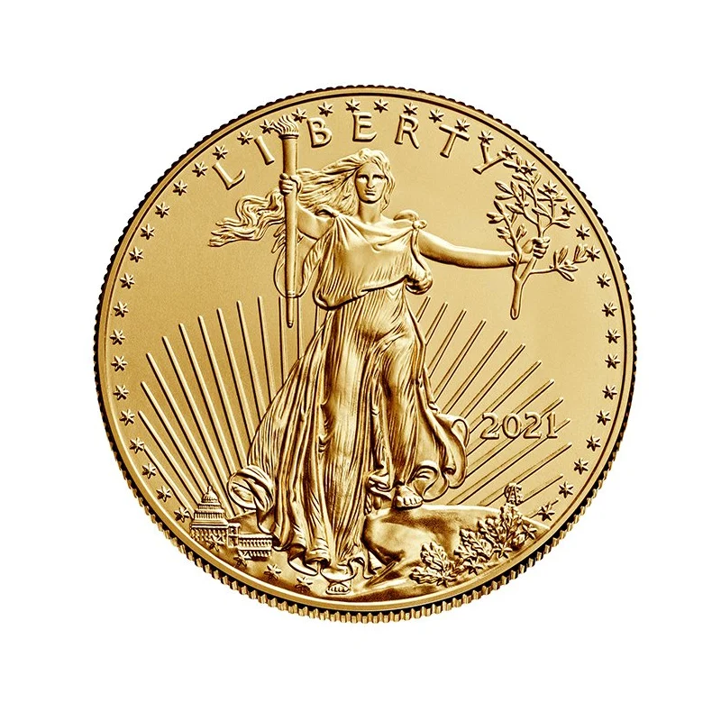 The beauty and power of America, captured in the graceful striding Liberty design by Augustus Saint-Gaudens for the 1907-1933 $20 U.S. Double Eagle gold coin is the basis for the American Gold Eagle coin. The reverse depicts a nest of American eagles signifying the strength and security of American families. This reverse design was used from 1986 to 2021. The quality and purity are guaranteed by the U.S. government, and by law, only gold mined in The United States is used in the minting of American Gold Eagles. Since its introduction in 1986, its four sizes, 1 oz., ½ oz., ¼ oz., and 1/10 oz., have become one of the world’s most widely traded gold bullion coins.
